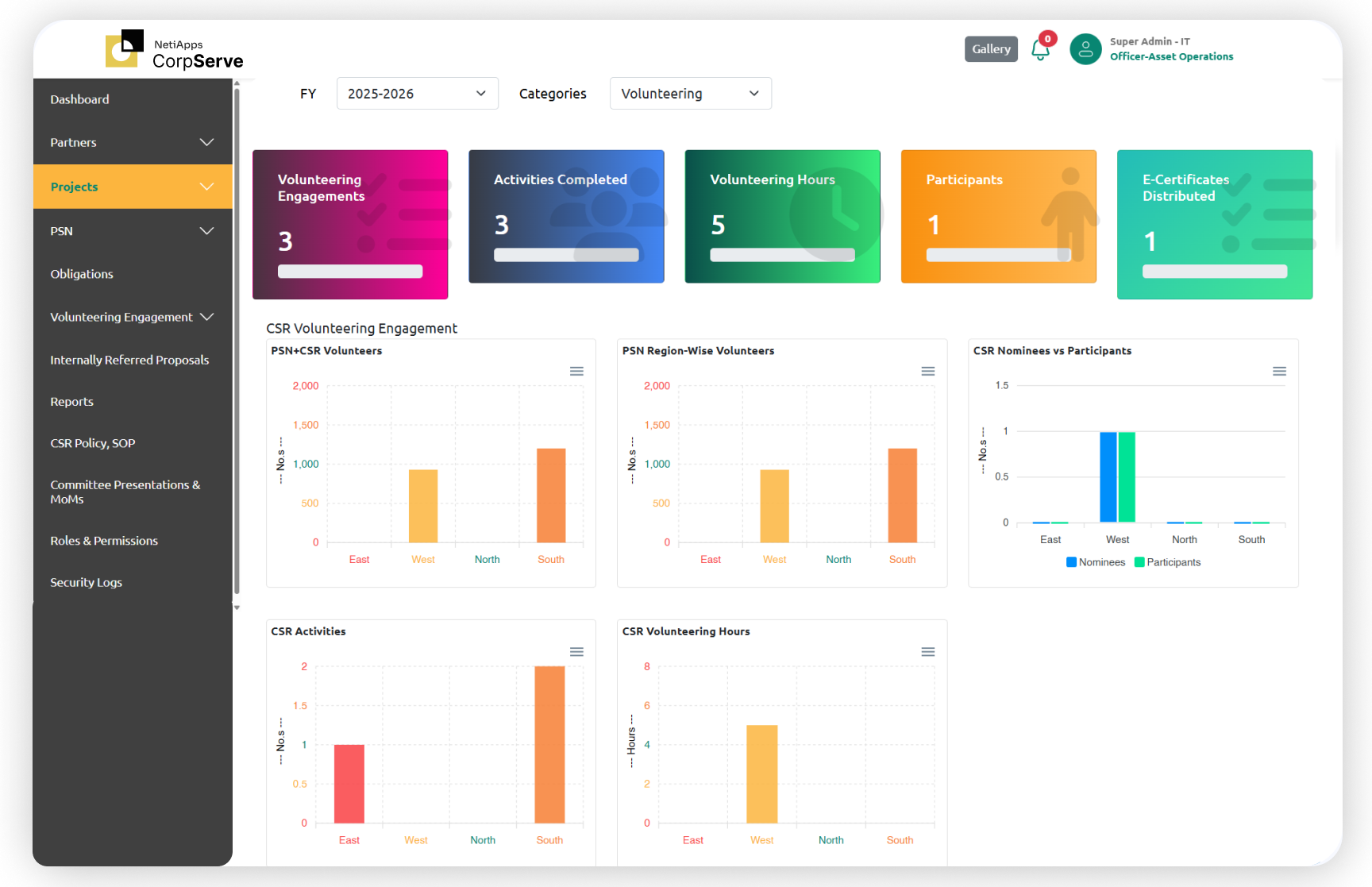 From CSR managers creating projects to employees registering for volunteering activities, every stakeholder gets a purpose-built view with the right level of access—nothing more, nothing less. Unlike fragmented solutions, the entire journey is connected in one system—project proposals, NGO onboarding, regional execution, volunteer management, budget tracking, and certificate issuance—all captured in a single, auditable record.